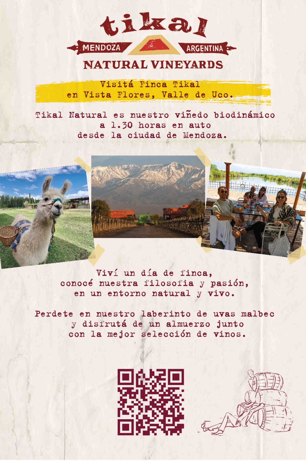 Tikal Natural Vineyards es la primera bodega biodinámica del Valle de Uco abierta al publico. La tierra se trabaja sin agroquímicos, siguiendo los ciclos de la luna y respetando lo que Ernesto llama «La lógica del alma».