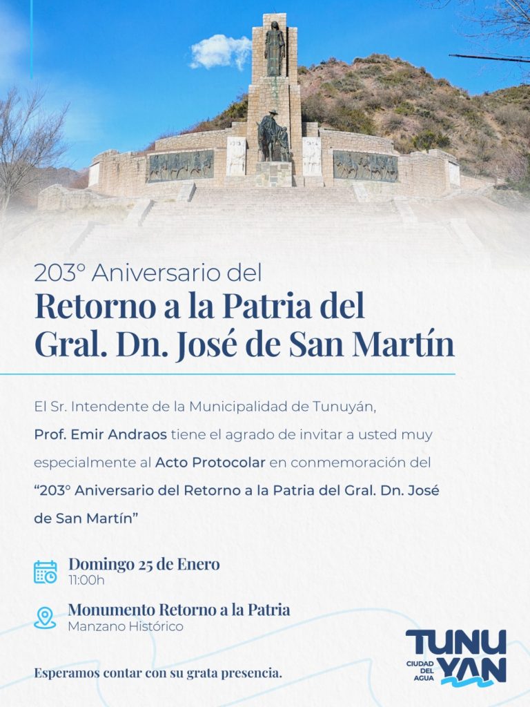 El próximo domingo 25 de enero, a las 11 horas, en el Monumento Retorno a la Patria del Manzano Histórico, se realizará el acto protocolar en conmemoración del 203° aniversario del Retorno a la Patria del General Don José de San Martín de su gesta libertadora. La ceremonia será organizada por la Municipalidad de Tunuyán, junto a instituciones locales, y contará con la presencia de autoridades, vecinos y visitantes.