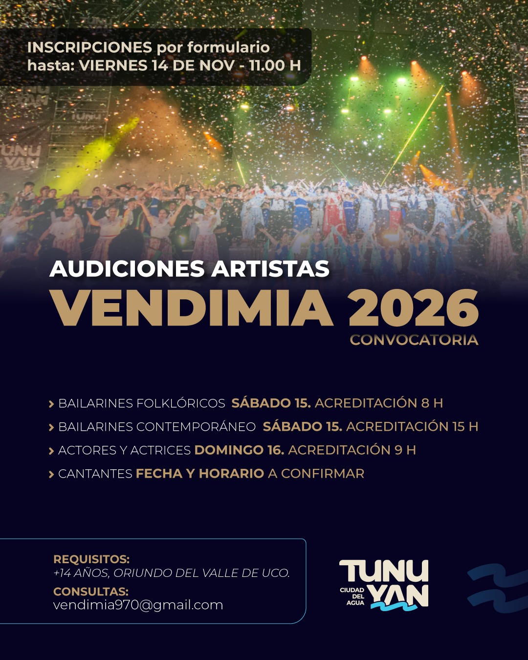 La Municipalidad de Tunuyán, a través de la Dirección de Cultura, convoca a artistas del Valle de Uco a participar de las audiciones para la Vendimia Departamental 2026. Las inscripciones estarán abiertas hasta el viernes 14 de noviembre a las 11.00 mediante el formulario https://forms.gle/CKxb42w3BJEGxVzy5
