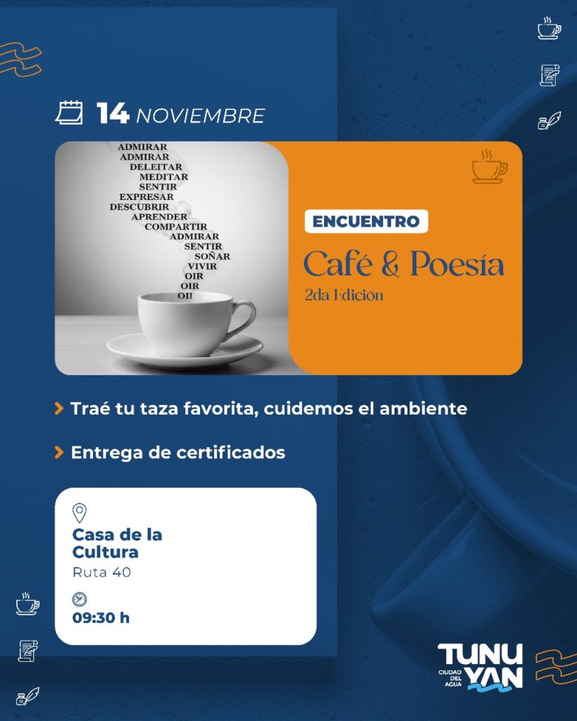 El próximo 14 de noviembre, a las 9.30, se realizará la segunda edición de “Café & Poesía” en la Casa de la Cultura (ex Casa del Maestro). La propuesta, organizada por la Dirección de Cultura de la Municipalidad de Tunuyán, busca fortalecer el desarrollo cultural y generar un espacio de intercambio entre escritores, poetas, estudiantes y vecinos.