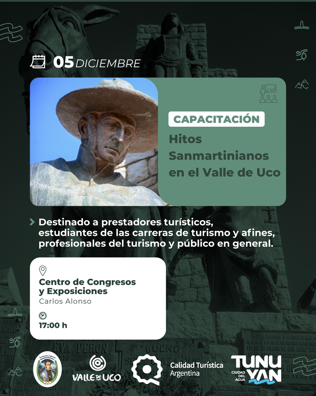 La Municipalidad de Tunuyán, a través de la Dirección de Turismo, junto a la Asociación Sanmartiniana en el Valle de Uco, llevará a cabo una capacitación sobre los «Hitos Sanmartinianos en el Valle de Uco». Esta propuesta busca enseñar sobre la historia del General San Martín en nuestra región.