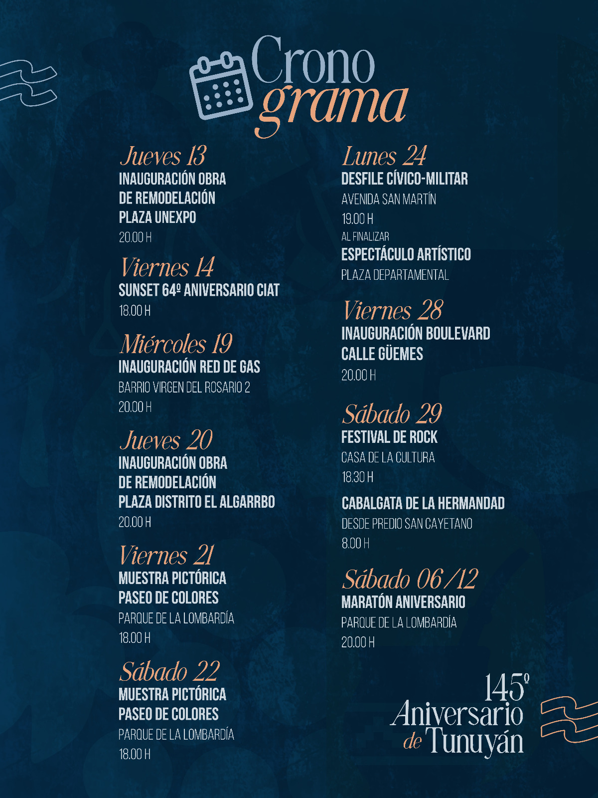 La Ciudad del Agua ya tiene cronograma de actividades por su 145° Aniversario. La agenda incluye inauguraciones de obras, propuestas culturales, muestras artísticas, actividades deportivas y el tradicional desfile cívico-militar, que se desarrollarán entre el 13 de noviembre y el 6 de diciembre.