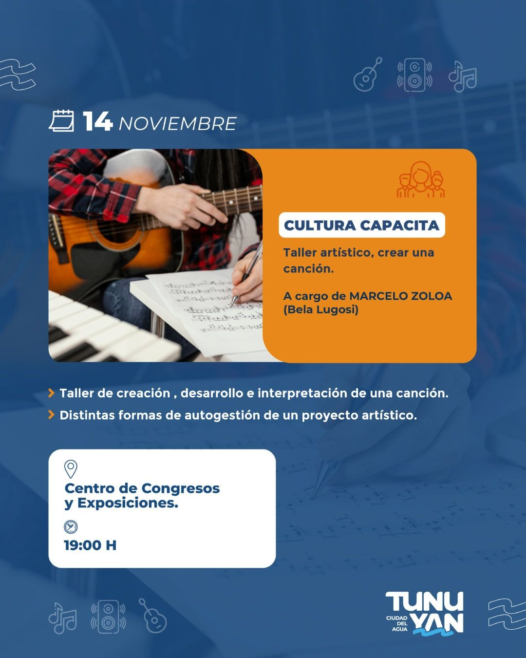 El próximo 14 de noviembre, el programa Cultura Capacita abre un nuevo espacio para quienes deseen transformar una idea en canción. El encuentro estará a cargo de Marcelo Zoloa, músico y compositor de la banda mendocina Bela Lugosi, y se realizará en el Centro de Congresos y Exposiciones, a las 19:00 horas.