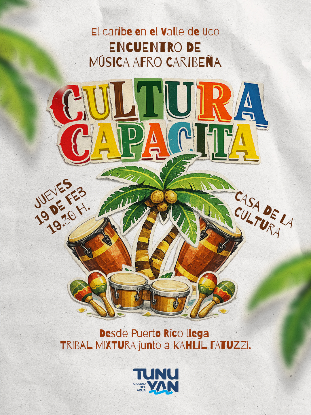 Este jueves 19 de febrero, a las 19:30 horas, se llevará a cabo una nueva edición de Cultura Capacita, dirigida tanto a músicos como al público en general. El encuentro tendrá lugar en la Casa de la Cultura y ofrecerá una propuesta formativa y artística centrada en la música afrocaribeña, promoviendo el intercambio y la capacitación.