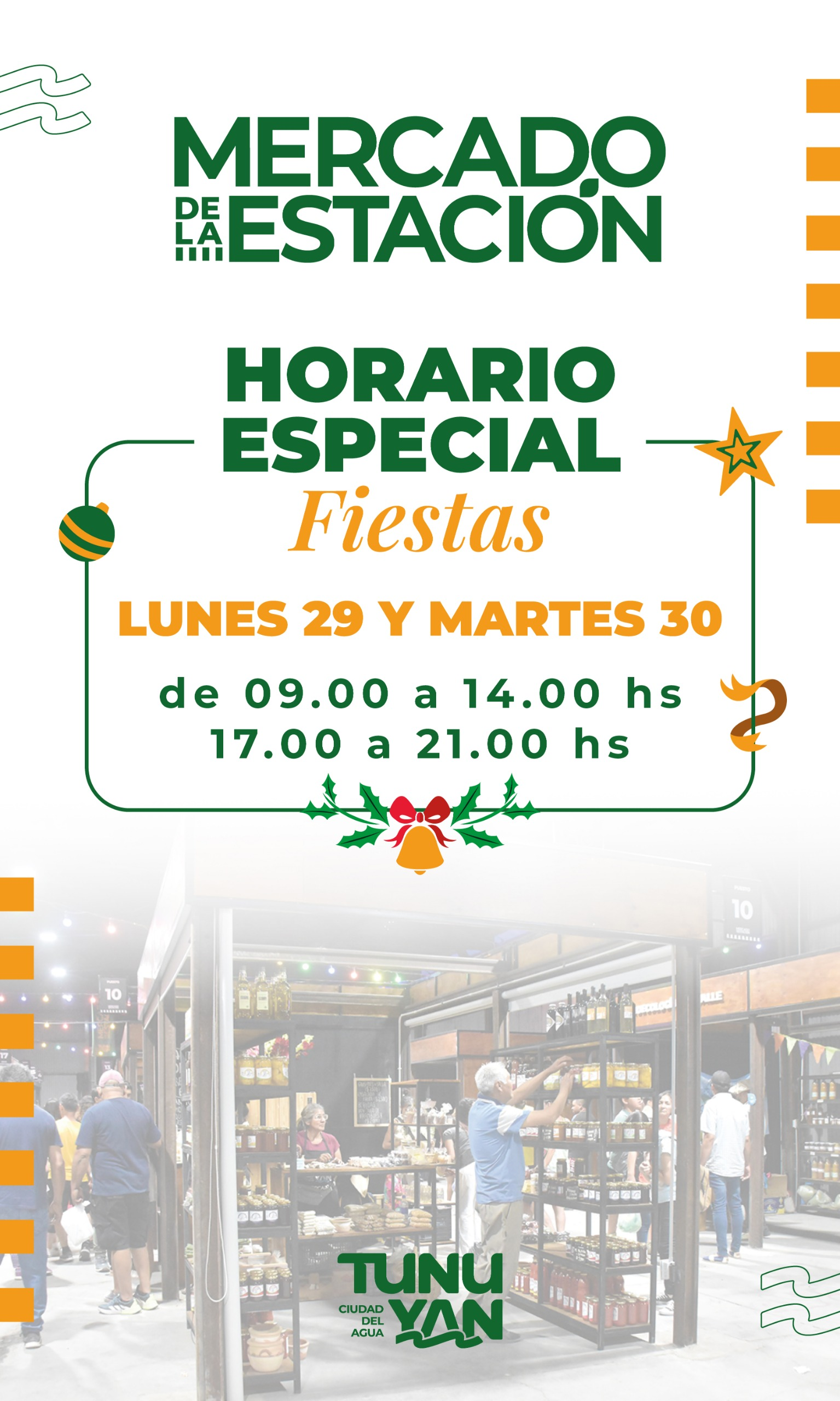 La Municipalidad de Tunuyán informa los horarios especiales del Mercado de la Estación con motivo de las celebraciones de fin de año. El espacio estará abierto al público el lunes 29 y martes 30 de diciembre, de 9 a 14 h y de 17 a 21 h, para que vecinos y vecinas puedan realizar sus compras con comodidad y anticipación.