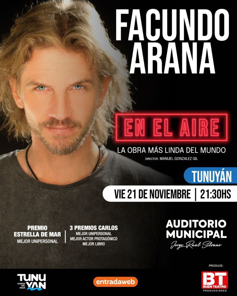 El reconocido actor Facundo Arana presentará su multipremiada obra En el Aire en el Auditorio Municipal de Tunuyán. La función será el 21 de noviembre, a las 21:30 horas. Este unipersonal está dirigido a vecinos y visitantes que deseen disfrutar de un espectáculo de calidad.
