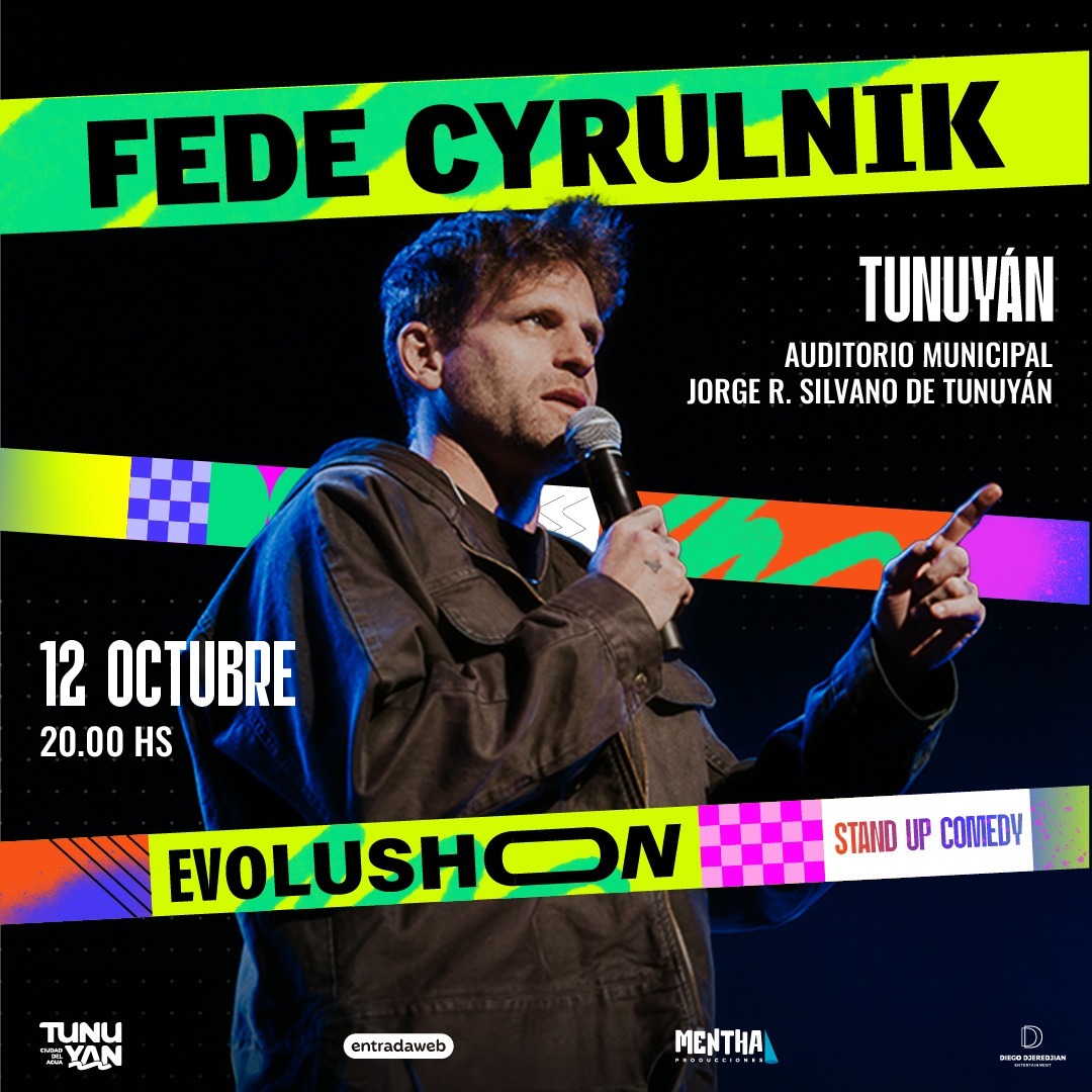 El domingo 12 de octubre a las 20:00 horas se presentará en el Auditorio Municipal “Dr. Jorge Raúl Silvano” el humorista Fede Cyrulnik con su show “Evolushon”. La función forma parte de un recorrido por distintas ciudades argentinas, luego de su exitosa gira internacional por España, Londres y Dublín.