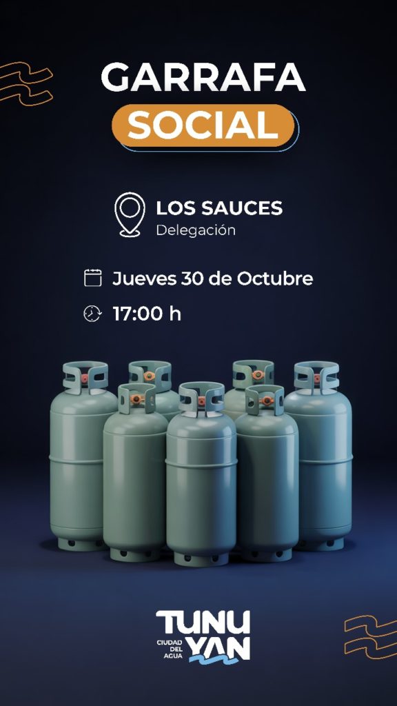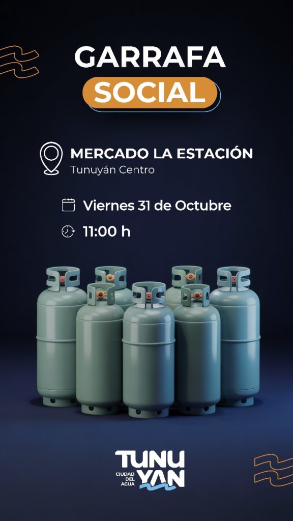 La Municipalidad de Tunuyán, a través de la Dirección de Desarrollo Social, llevará adelante una nueva etapa del operativo Garrafa Social. Esta semana, la actividad se realizará el jueves 30 de octubre a las 17 horas en la Delegación Municipal de Los Sauces, y el viernes 31 de octubre a las 11 horas en el Mercado de la Estación, en el centro. El programa tiene como objetivo facilitar el acceso al gas envasado a familias que lo necesiten.