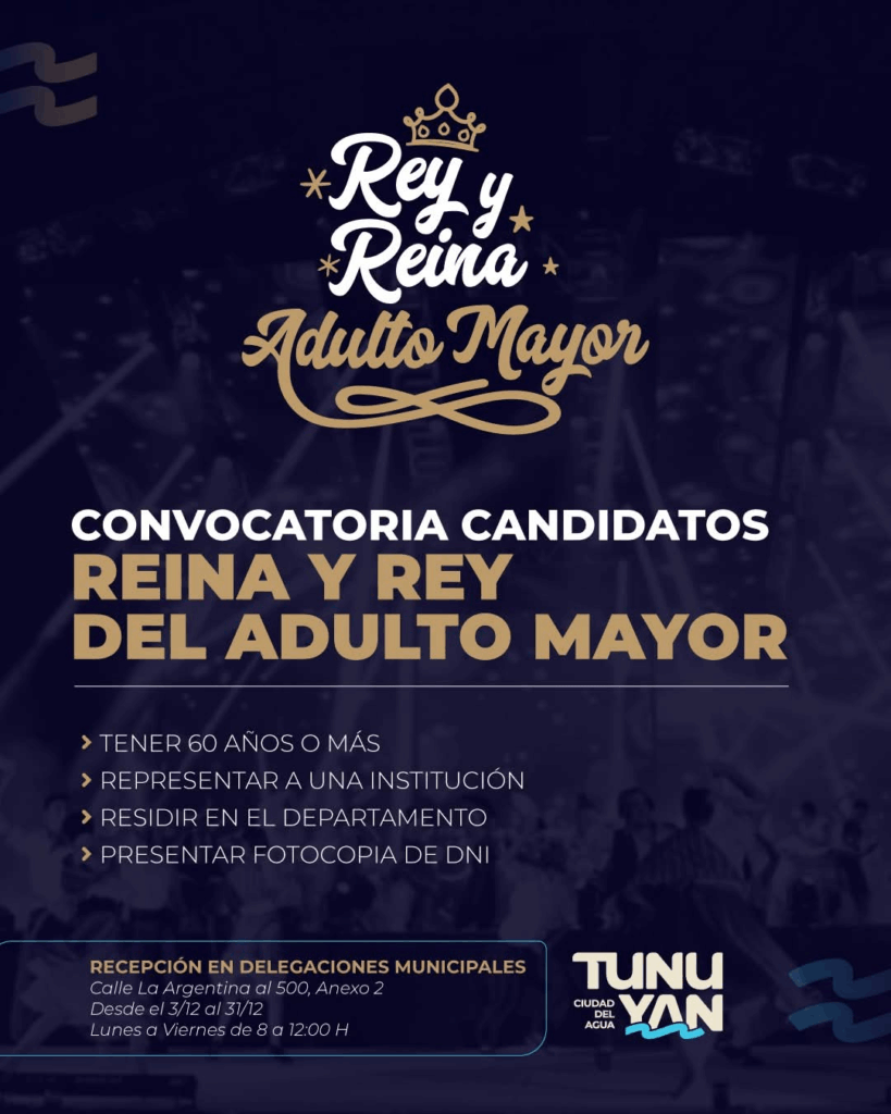 La Municipalidad de Tunuyán, a través de la Dirección de Gestión Social, invita a participar de la convocatoria para elegir al Rey y la Reina del Adulto Mayor, una propuesta que celebra la alegría, la trayectoria y el espíritu de quienes construyen comunidad con su ejemplo cotidiano. La iniciativa está dirigida a personas mayores de 60 años que residan en el departamento y representen a una institución local.