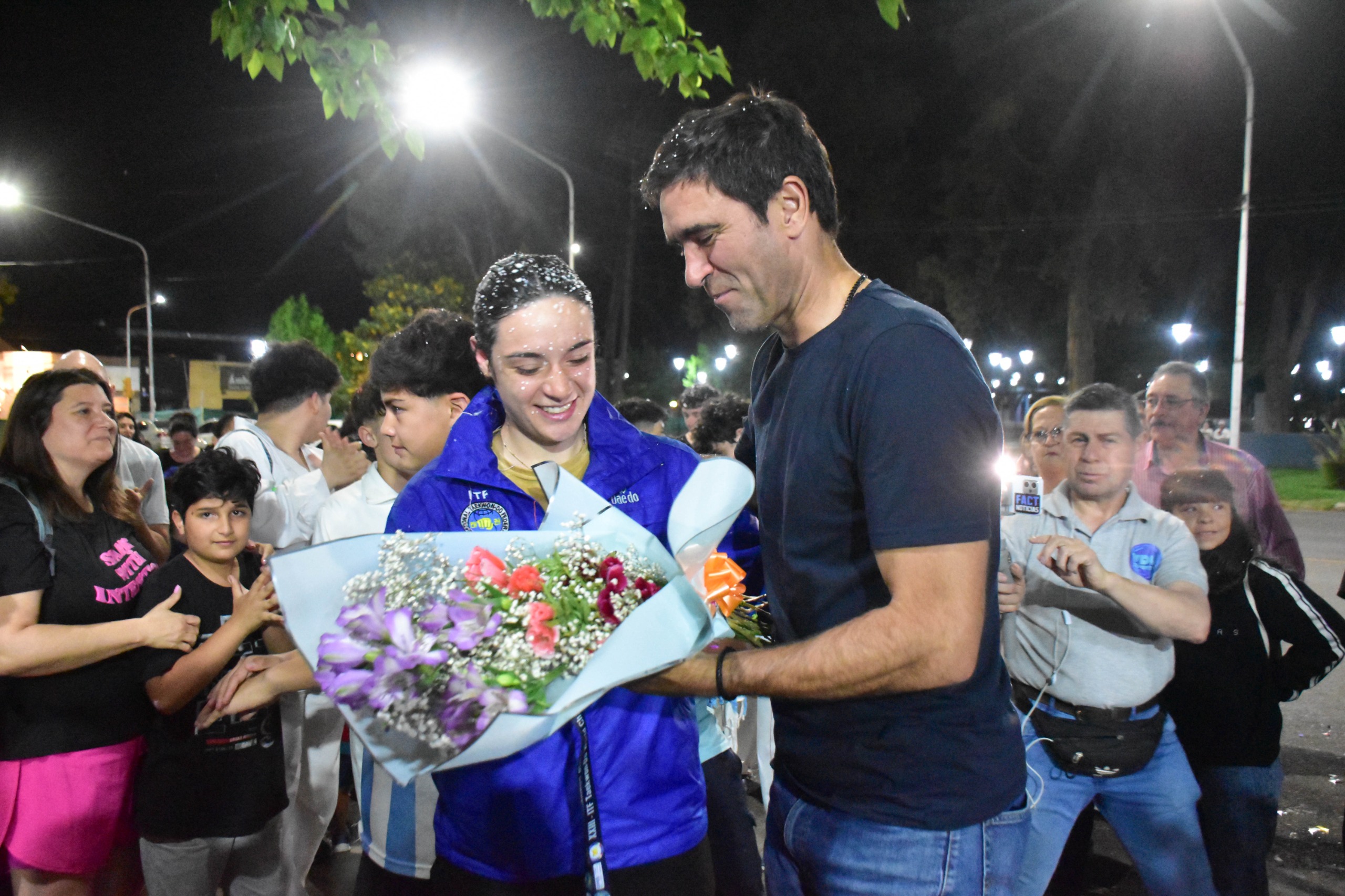 El intendente Emir Andraos junto a la directora de Deportes Agustina Caetano, la recibieron con un ramo de flores y palabras de reconocimiento. “Mi pueblo me ha recibido de la mejor manera, con una bienvenida extraordinaria. Estoy orgullosa y muy agradecida, hay mucho esfuerzo detrás de esta medalla de bronce”, expresó Josefina. Fue una ovación continua que celebró no sólo su medalla, sino el camino recorrido para alcanzarla.