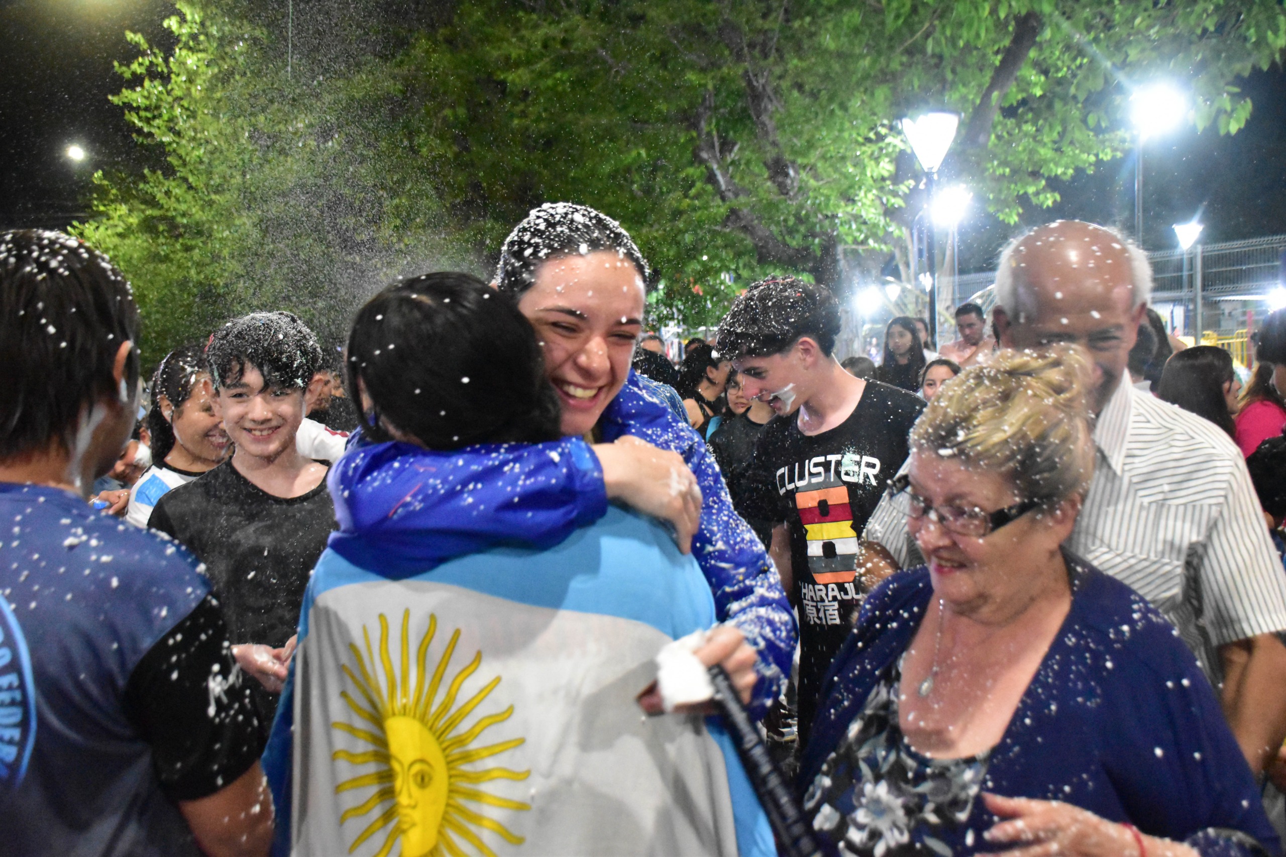 La caravana que acompañó a Josefina desde el ingreso al distrito hasta la plaza fue encabezada por los Bomberos Voluntarios. A su lado viajaba su hermano Julián, mientras que sus padres, Jesús y Noelia, la esperaban entre abrazos. El grito de “¡Dale campeona!” se escuchó fuerte entre la multitud que la recibió con orgullo.