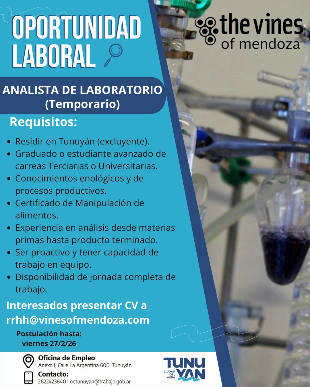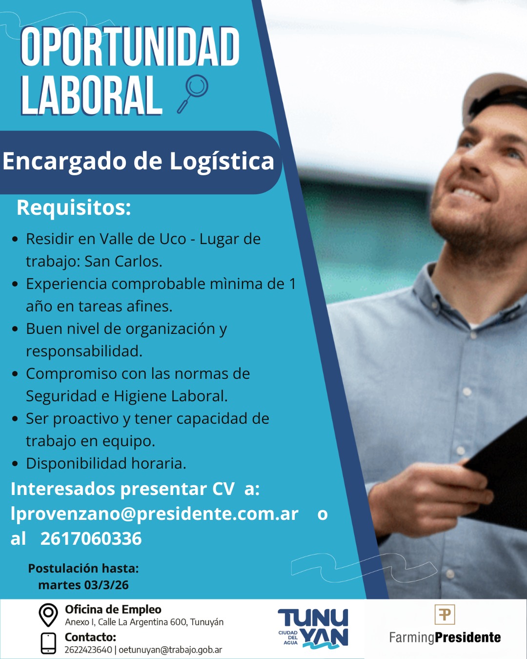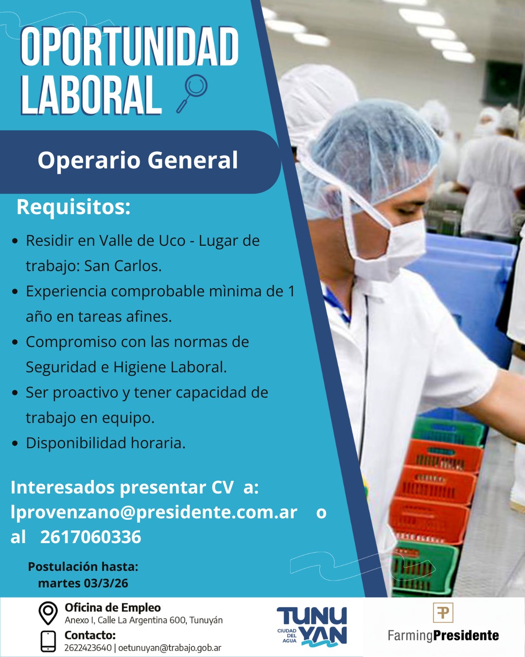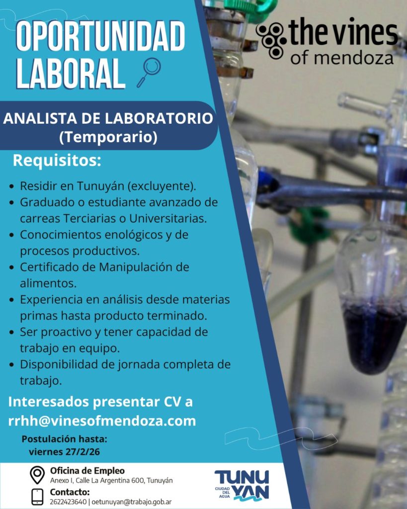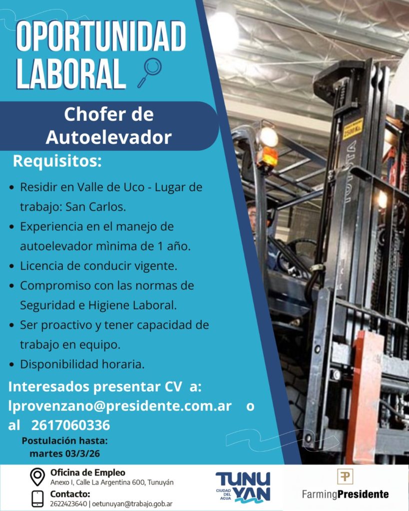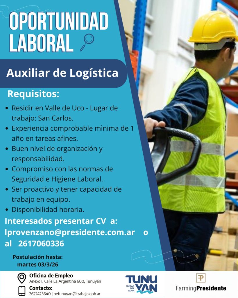 La Oficina de Empleo de la Municipalidad de Tunuyán informa que se encuentran activas nuevas búsquedas para cubrir puestos en el sector productivo. Las convocatorias están dirigidas a personas residentes en el Valle de Uco que reúnan los requisitos establecidos para cada puesto. La recepción de postulaciones será hasta el martes 3 de marzo.