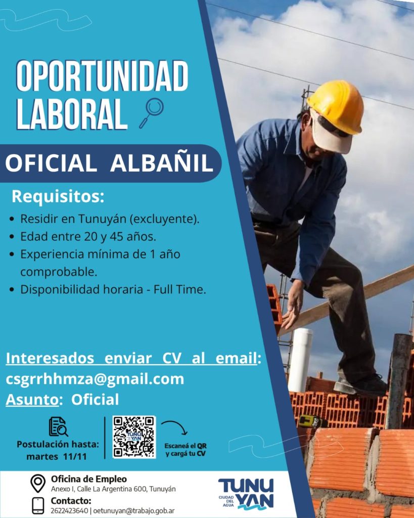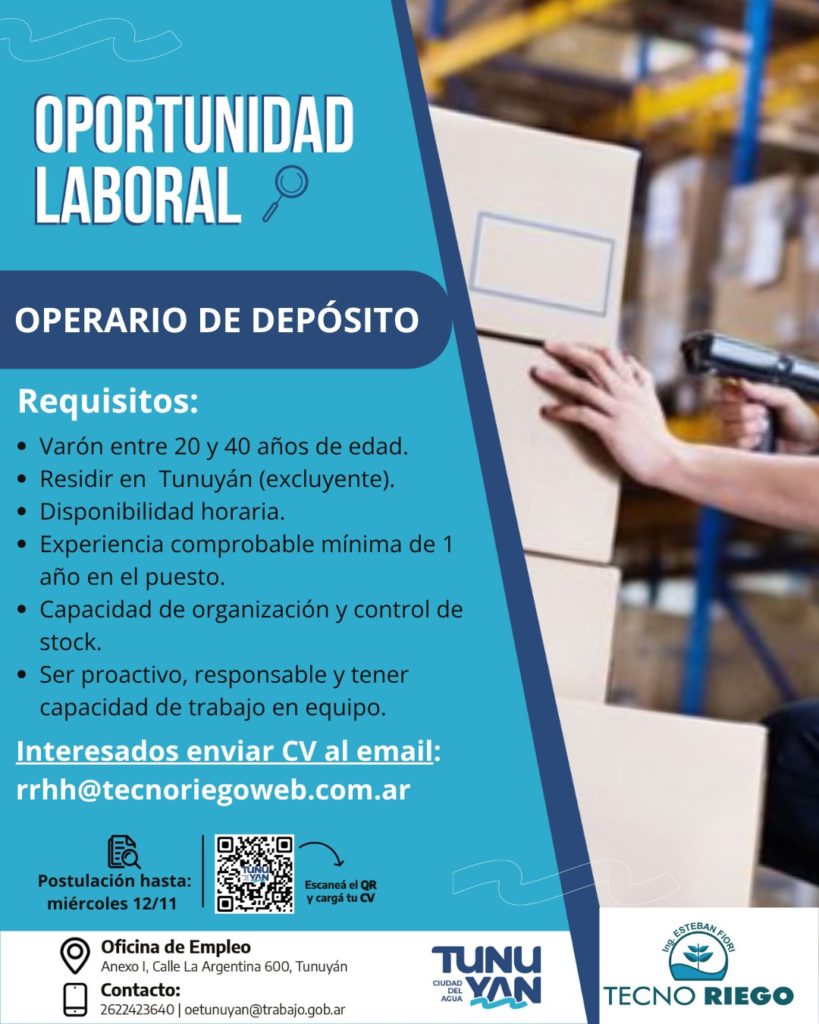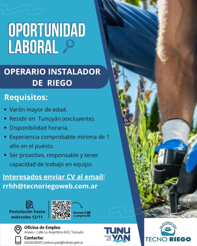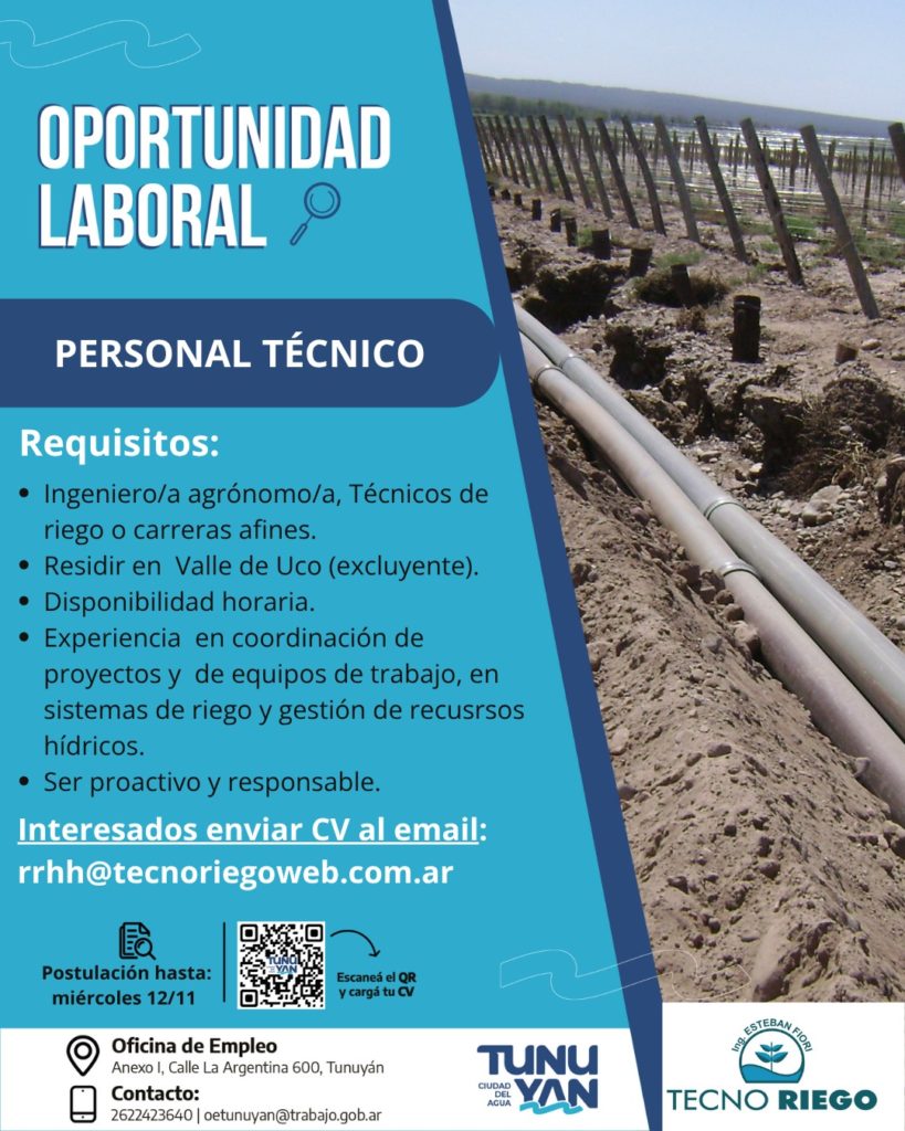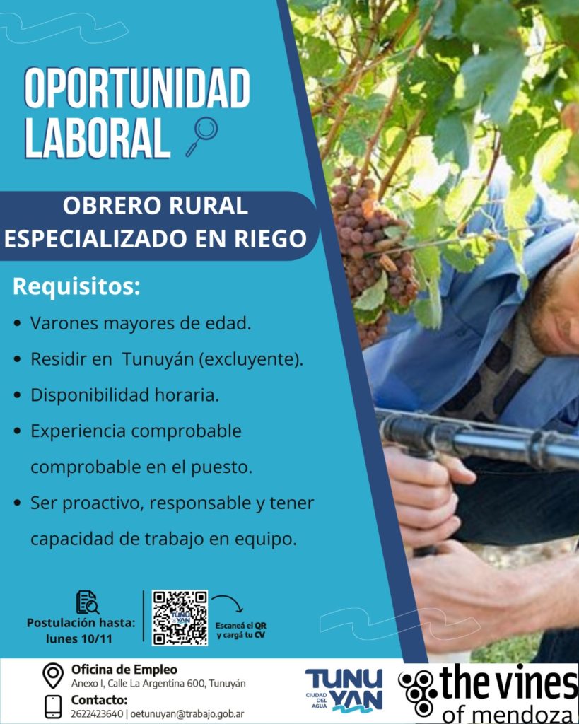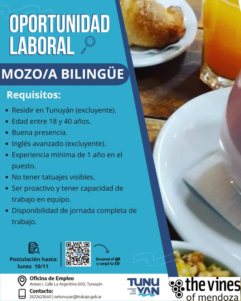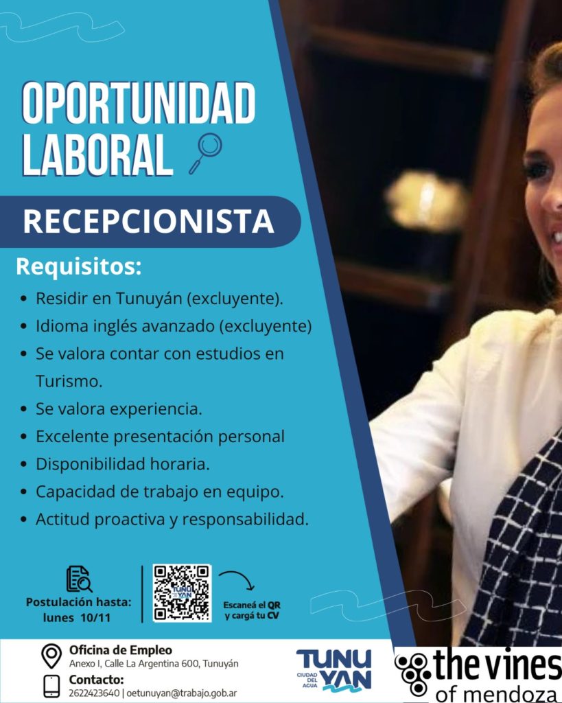 El canal se denomina BOLSA DE TRABAJO – Municipalidad de Tunuyán y está destinado a facilitar la comunicación entre quienes buscan empleo y las oportunidades que se generan en el departamento. Allí se publicarán regularmente las vacantes activas, junto con los requisitos y formas de contacto.