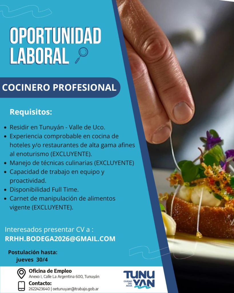 Asimismo, se abrió la convocatoria para Cocinero Profesional, dirigida a quienes cuenten con experiencia comprobable en cocina de hoteles y/o restaurantes de alta gama vinculados al enoturismo, manejo de técnicas culinarias y carnet de manipulación de alimentos vigente.