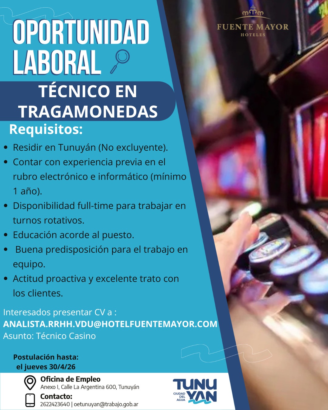 Por un lado, se encuentra disponible la búsqueda de Técnico en Tragamonedas, destinada a personas con experiencia en el rubro electrónico e informático, disponibilidad full-time para turnos rotativos y buena predisposición para el trabajo en equipo.