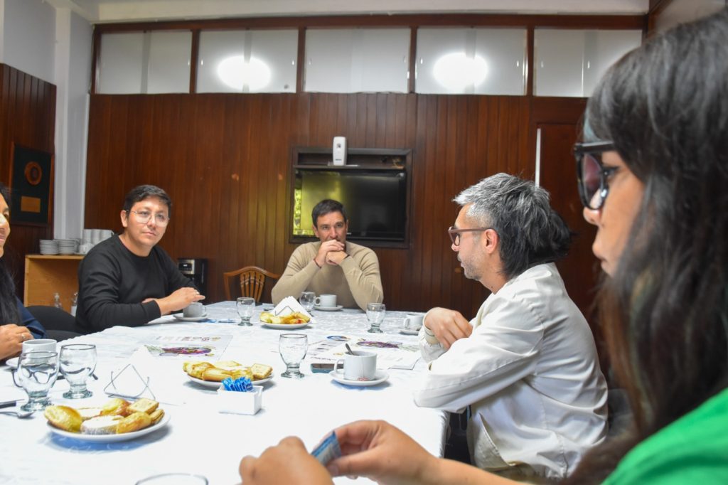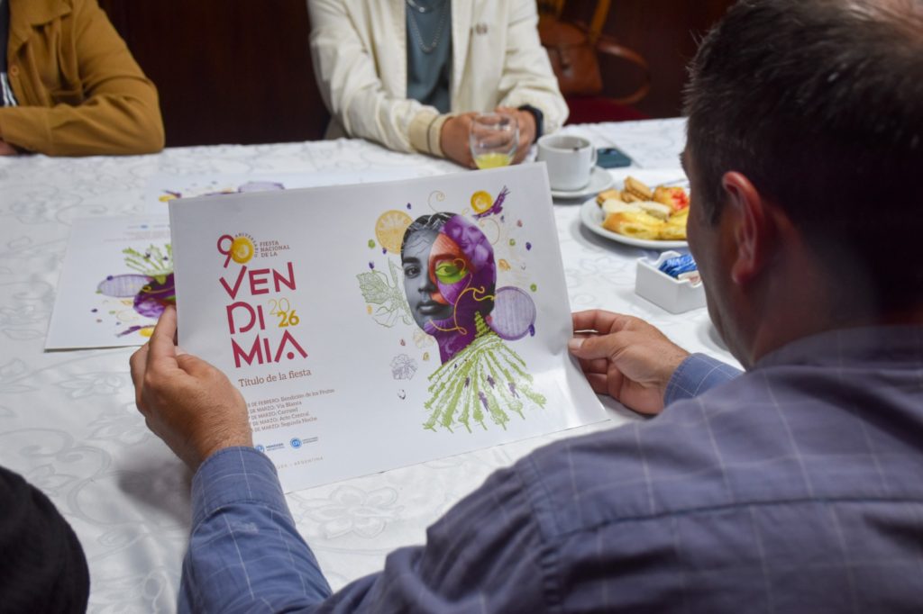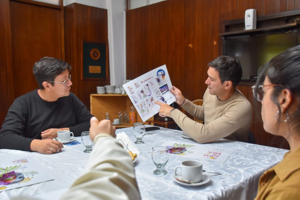 El intendente del departamento Emir Andraos recibió con un desayuno a los diseñadores responsables del afiche oficial de la edición N° 90 de la Fiesta de la Vendimia. El encuentro se realizó en la mañana del lunes en el edificio municipal, donde los autores de la obra compartieron detalles del proceso creativo. Participaron los tres integrantes del equipo: Rita Carrizo Ogas, Luz Carrizo y Jonathan Quiroga.