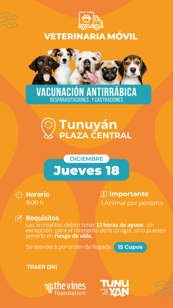 La Municipalidad de Tunuyán, junto a The Vines Foundation, continúa con el operativo de atención veterinaria gratuita en distintos puntos del departamento. Esta semana, la unidad móvil estará presente en:
