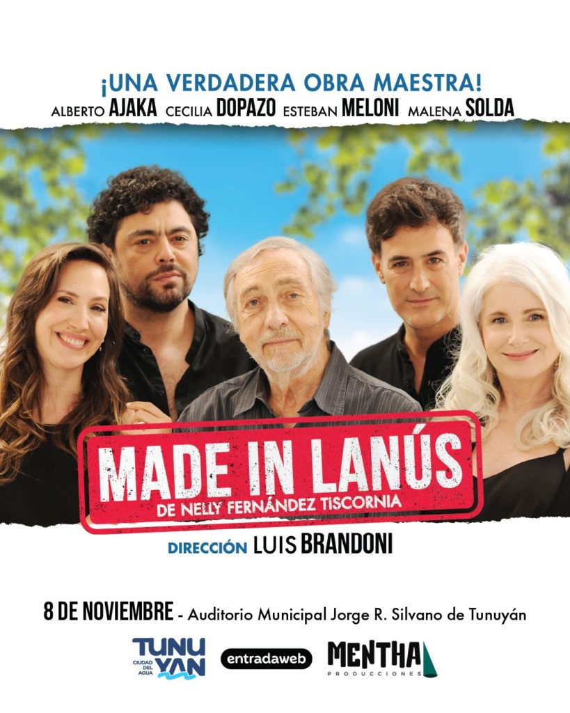 El sábado 8 de noviembre, a las 21:00 horas, el Auditorio Municipal “Dr. Jorge Raúl Silvano” será escenario de la obra “Made in Lanús”, una producción realizada bajo la dirección de Luis Brandoni. La propuesta cuenta con un elenco de grandes artistas integrado por Alberto Ajaka, Cecilia Dopazo, Esteban Meloni y Malena Solda.