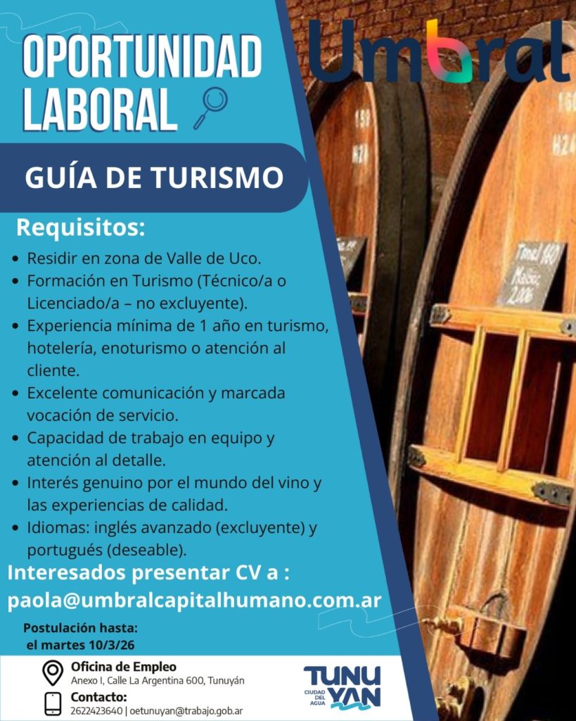 Desde la Dirección de Desarrollo Económico destacaron que estas convocatorias forman parte del trabajo articulado con empresas de la región para fortalecer la inserción laboral y acompañar el crecimiento productivo local. Las personas interesadas en los puestos gastronómicos deberán enviar su CV a cuyotrabajo@gmail.com. Para el perfil de guía de turismo, la postulación debe remitirse a paola@umbralcapitalhumano.com.ar.