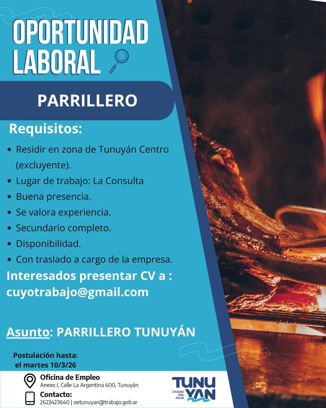 La Oficina de Empleo atiende en Anexo I, Calle La Argentina 600, Tunuyán. Para consultas o asesoramiento sobre el proceso de postulación, se encuentran habilitados el teléfono 2624233640 y el correo electrónico oetunuyan@trabajo.gob.ar.
