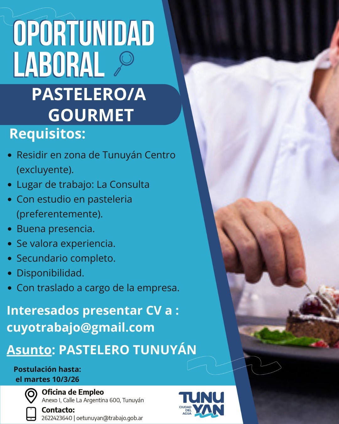 La Oficina de Empleo de la Municipalidad de Tunuyán informa que se encuentran abiertas tres convocatorias laborales destinadas a cubrir puestos en el sector gastronómico y turístico del Valle de Uco. Las postulaciones estarán vigentes hasta el martes 10 de marzo de 2026 y contemplan perfiles con distintos niveles de formación y experiencia.