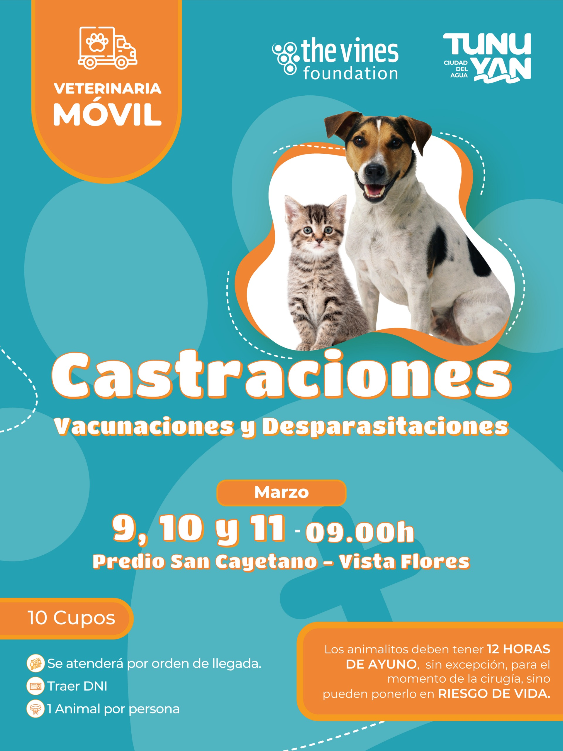 La Municipalidad de Tunuyán, junto a la Fundación The Vines, llevará adelante un nuevo operativo de la Veterinaria Móvil en el Predio San Cayetano de Vista Flores los días 9, 10 y 11 de marzo a partir de las 9:00 horas.