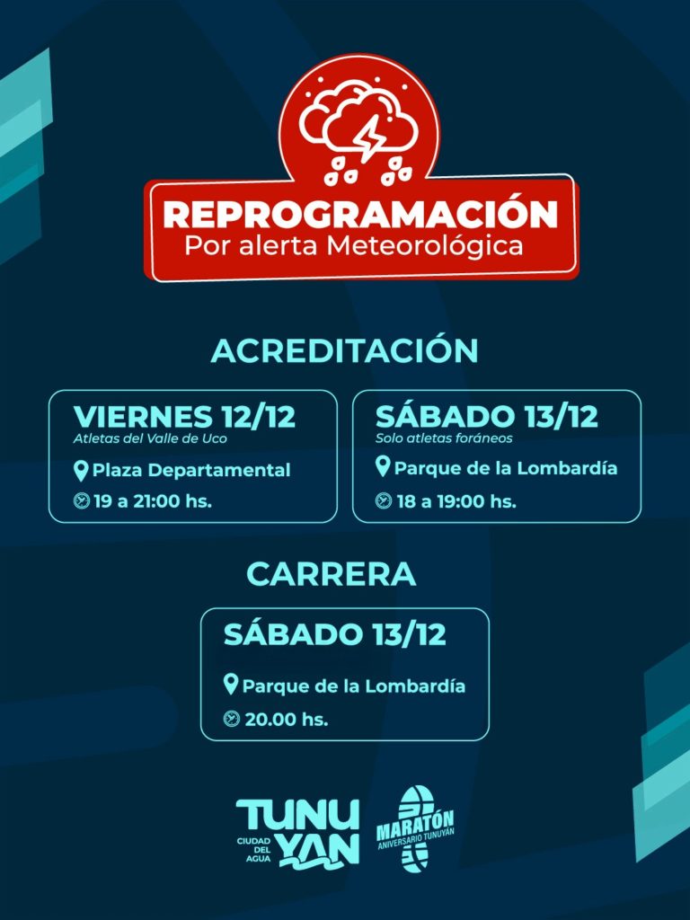 Ante la alerta meteorológica que rige para el Valle de Uco en los próximos días, la Municipalidad de Tunuyán informa la reprogramación de la Maratón Aniversario. La medida fue adoptada para resguardar la seguridad de los competidores y de las familias que, año tras año, eligen participar de la gran fiesta deportiva de la Ciudad del Agua.