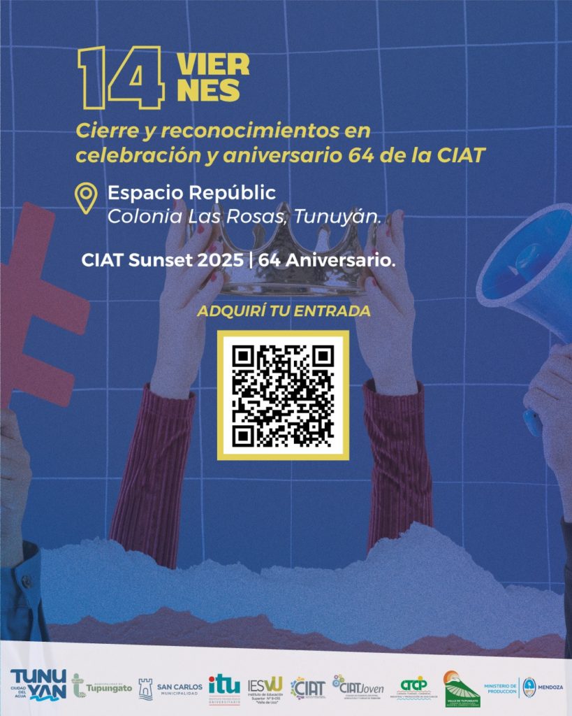 En el marco de la celebración del aniversario de la CIAT, se realizará el evento Sunset 2025 en el Espacio Republic, Colonia Las Rosas. Allí se reconocerá a los ganadores del concurso. Los proyectos premiados tendrán un stand conjunto habilitado para la exposición de sus productos, cerrando la semana con un espacio de celebración, networking y proyección.
