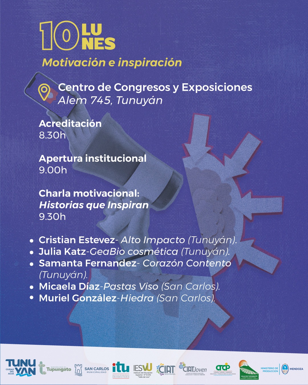 La semana comienza con la jornada “Historias que inspiran”, una charla motivacional a cargo de emprendedores locales que compartirán sus experiencias de vida y trabajo. La cita es en Centro de Congresos y Exposiciones Carlos Alonso, desde las 9 hs.
