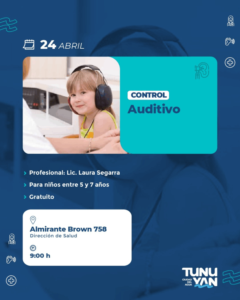 La Dirección de Desarrollo Humano y Salud de la Municipalidad de Tunuyán comunica que el próximo 24 de abril se llevará a cabo un control auditivo gratuito destinado a niños y niñas de 5 a 7 años. La jornada se realizará en la Dirección de Salud, Almirante Brown 758, a partir de las 9:00 horas, con la participación de la profesional Lic. Laura Segarra. La propuesta busca fortalecer la prevención en salud infantil y acompañar el crecimiento integral de las familias.