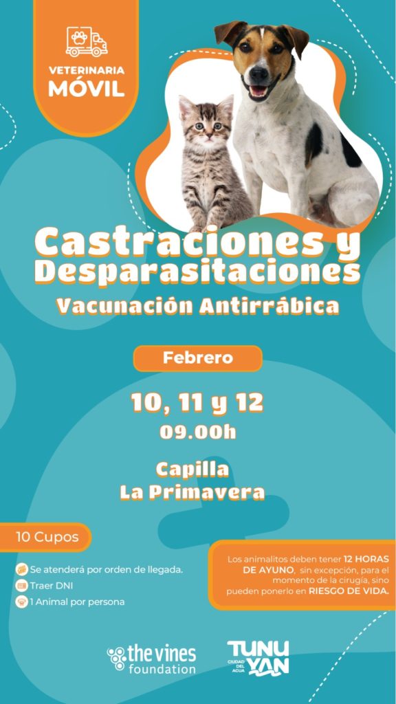 Los días 10, 11 y 12 de febrero se realizará un operativo de veterinaria móvil en Capilla La Primavera Tunuyán, con atención prevista a partir de las 9 horas. La acción incluirá castraciones, desparasitaciones y vacunación antirrábica para mascotas. La actividad es organizada de manera conjunta por el Municipio y la fundación The Vines Foundation.