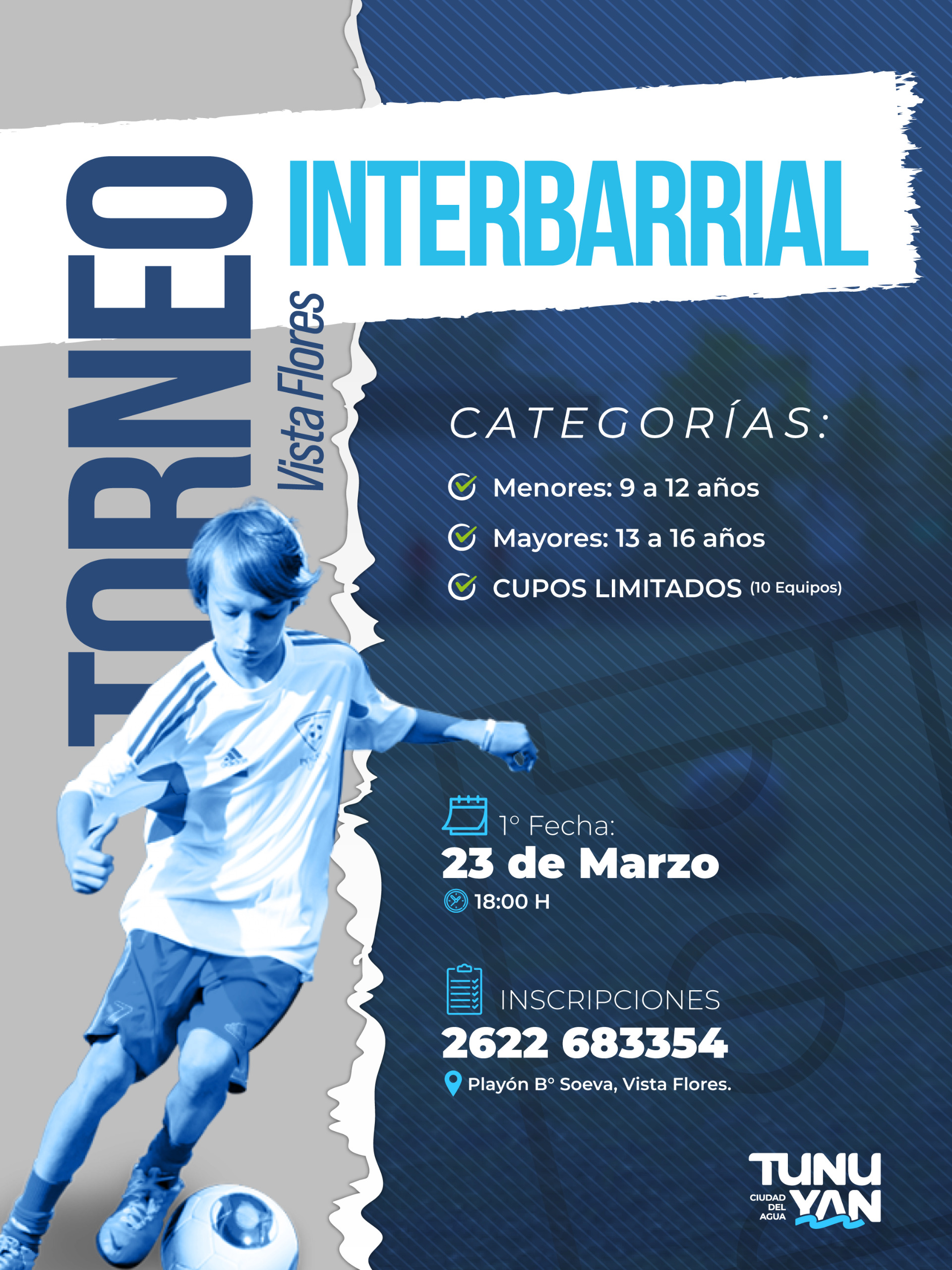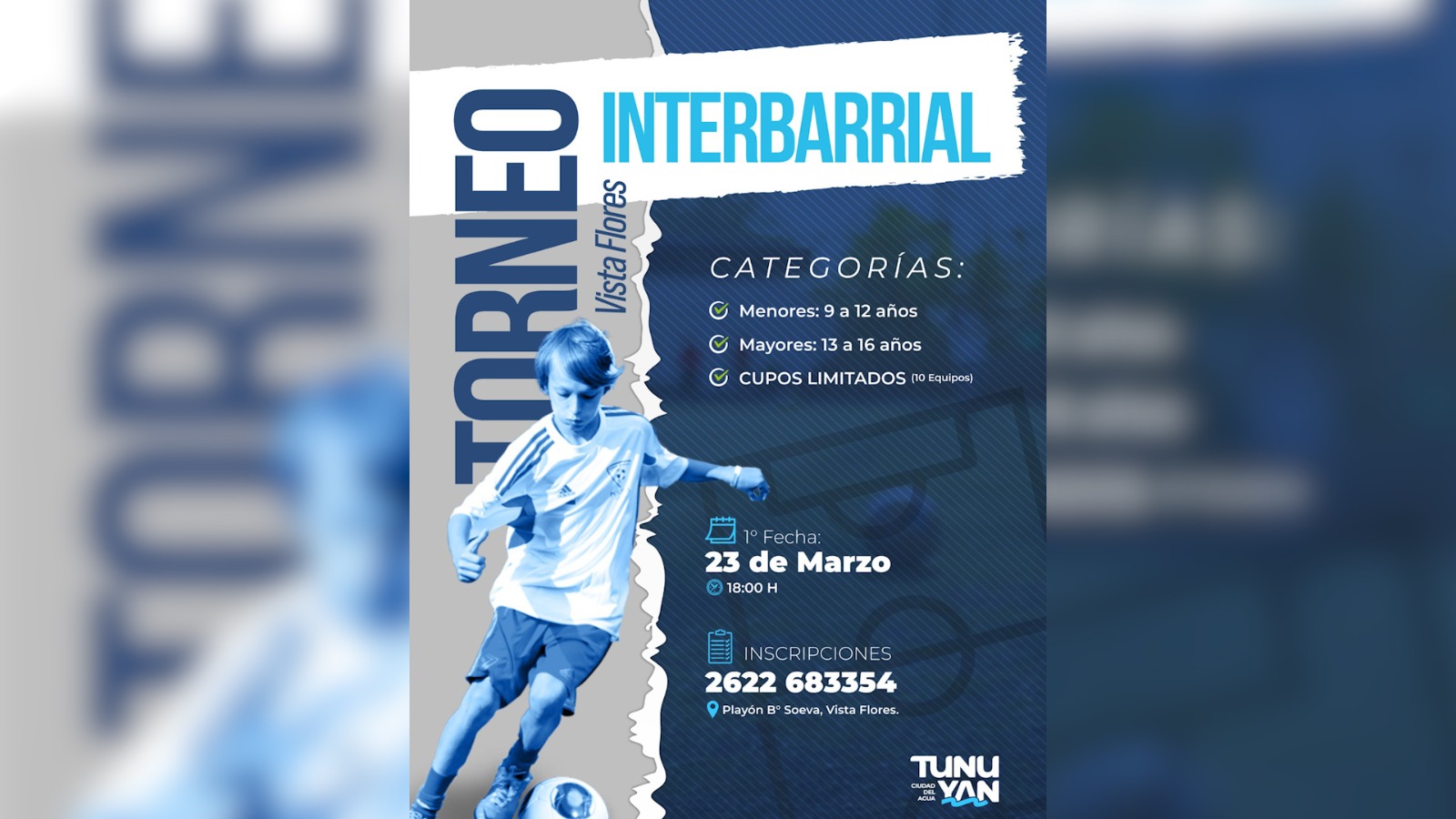 El domingo 23 de marzo a las 18:00 horas se jugará la primera fecha del Torneo Interbarrial Vista Flores, en el playón del barrio Soeva. Participarán equipos de los barrios del distrito Vista Flores y este año se suman las escuelitas de iniciación al deporte de Campo Los Andes y Villa Seca. La propuesta busca promover el deporte y generar espacios de encuentro para niños y adolescentes.