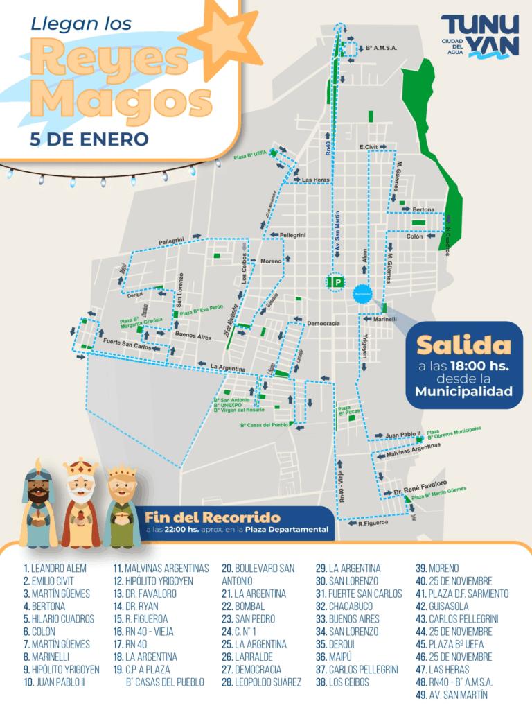 Los Reyes Magos recorrerán distintos barrios del departamento el lunes 5 de enero, desde las 18 horas, en una caravana llena de magia y alegría. La salida será desde la Municipalidad y el cierre está previsto alrededor de las 22 horas en la Plaza Departamental. El recorrido incluirá numerosos puntos, llevando fantasía, color y emoción a cada rincón por donde pasen.